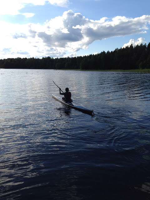 | Kayaking in the beautiful Finnish lake view. |